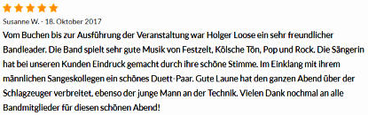 Ich möchte mich im Namen unserer Gesellschaft bei der Band bedanken. Ihr habt fantastische Musik gemacht und die Party gerockt. Mit einem sehr großen Spektrum habt Ihr die Besucher begeistert. Ob Wiesnhits, Schlager, Ballermann, Charts, Rock oder Karneval. Es war einfach alles dabei und Ihr habt somit jeden Geschmack getroffen. Ihr habt direkt für Stimmung gesorgt und die Gäste zum Tanzen und Mitsingen gebracht. Ihr seid sehr sympathische Leute und es hat einfach nur Spaß mit Euch gemacht. Wir werden Euch sicherlich wieder verpflichten und freuen uns schon jetzt auf eine geile Party.